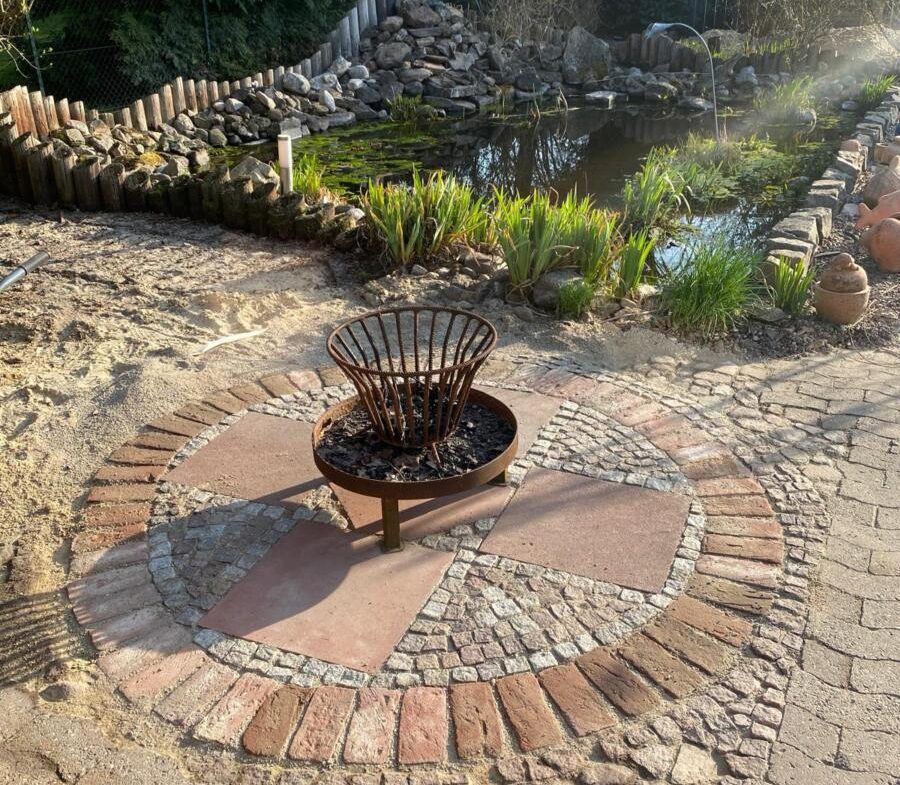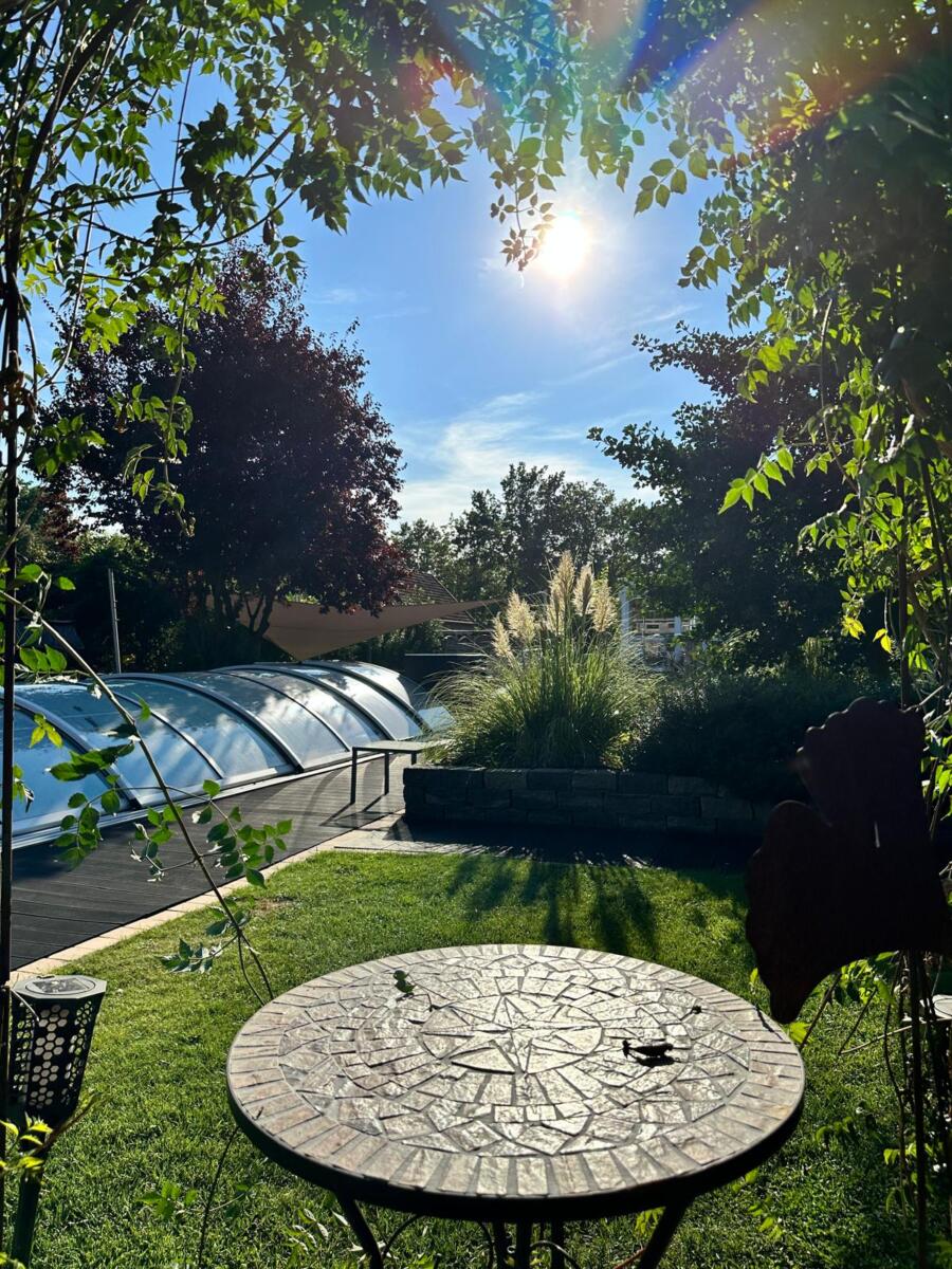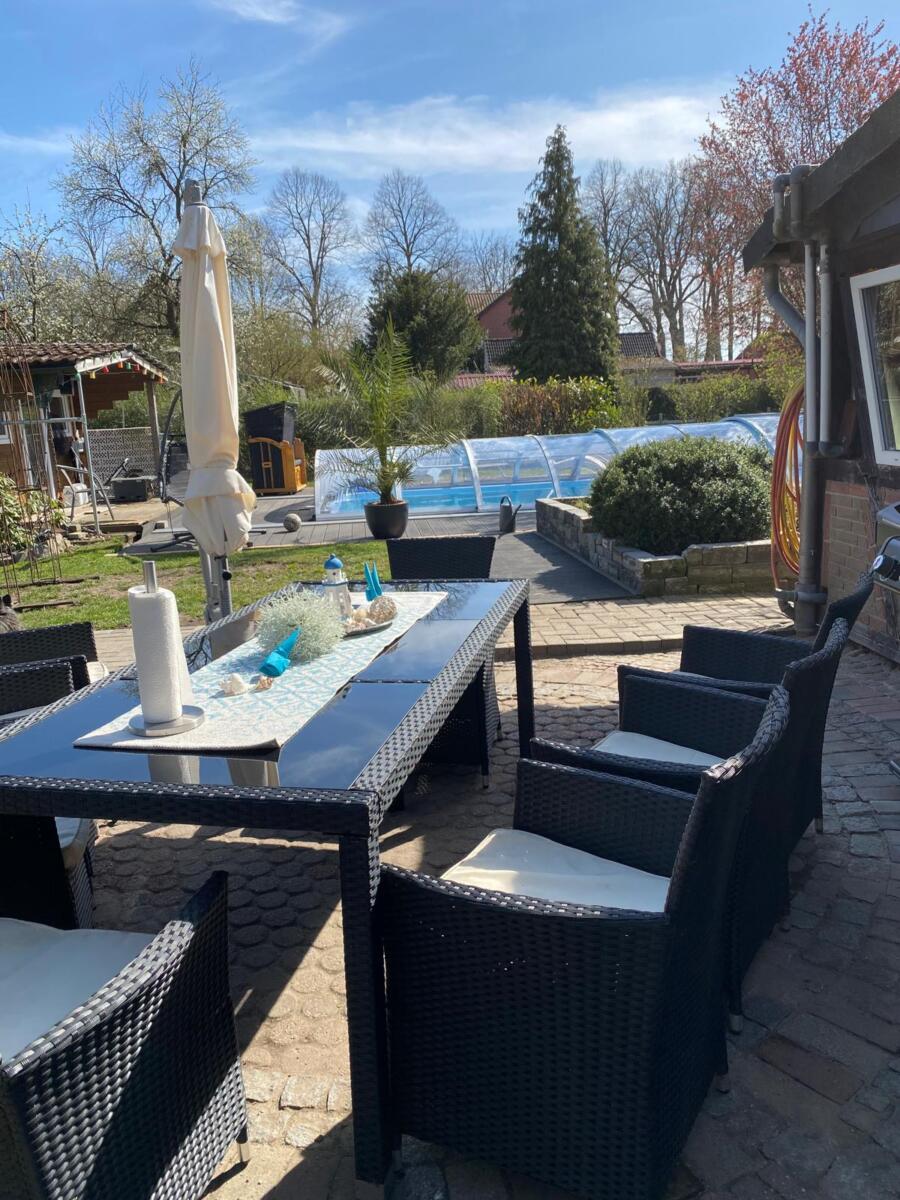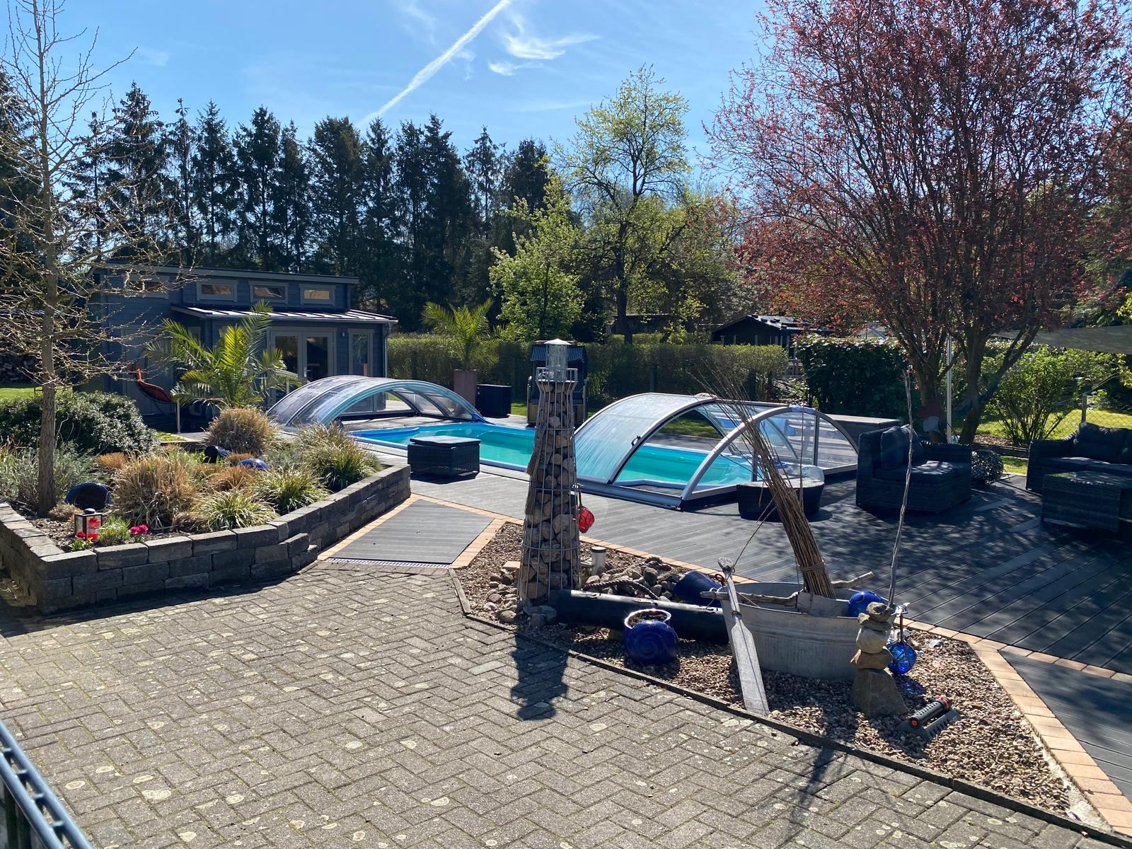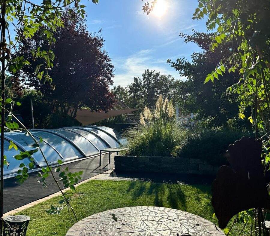 Sitzgruppen sind beim Pool unter einem Sonnensegel oder hinter dem Carport am Teich.