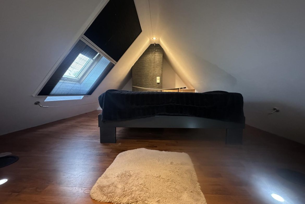 Im OG ist der grosse Wohnraum mit der Raumspartreppe in den Spitzboden zum Schlafen auf der Gebäude-Vorderseite, auf der Gehäuserückseite der klimatisierte (Schlaf-) Raum mit Balkon und Markise.