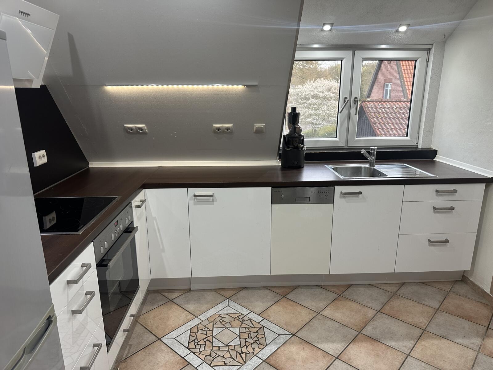 Küche mit Spülmaschine, Backofen, Kühl/Gefrierkombination, Stehtisch