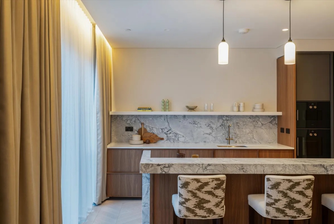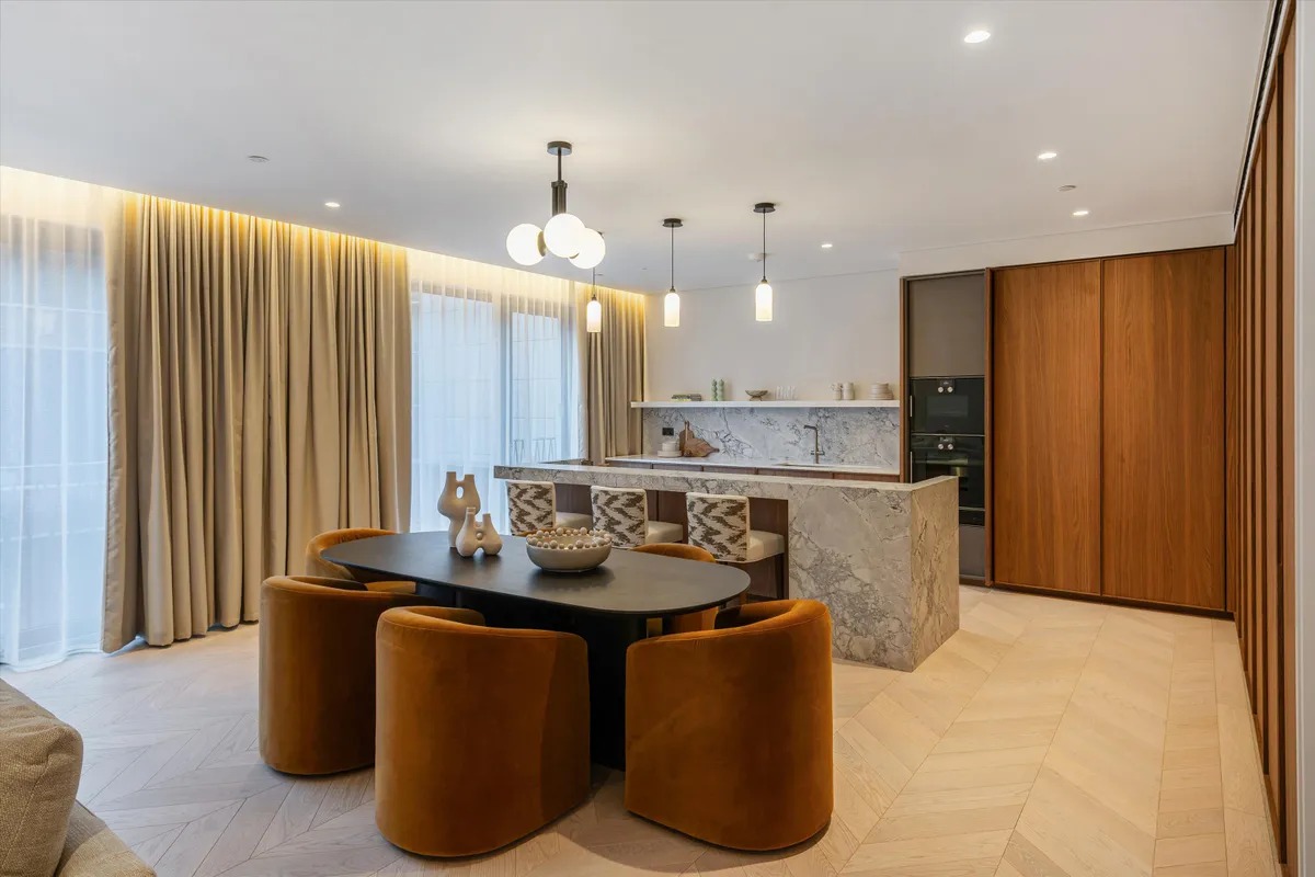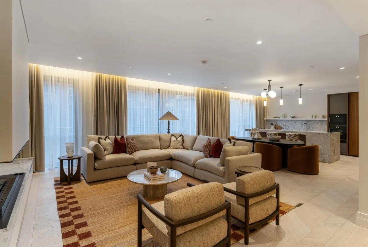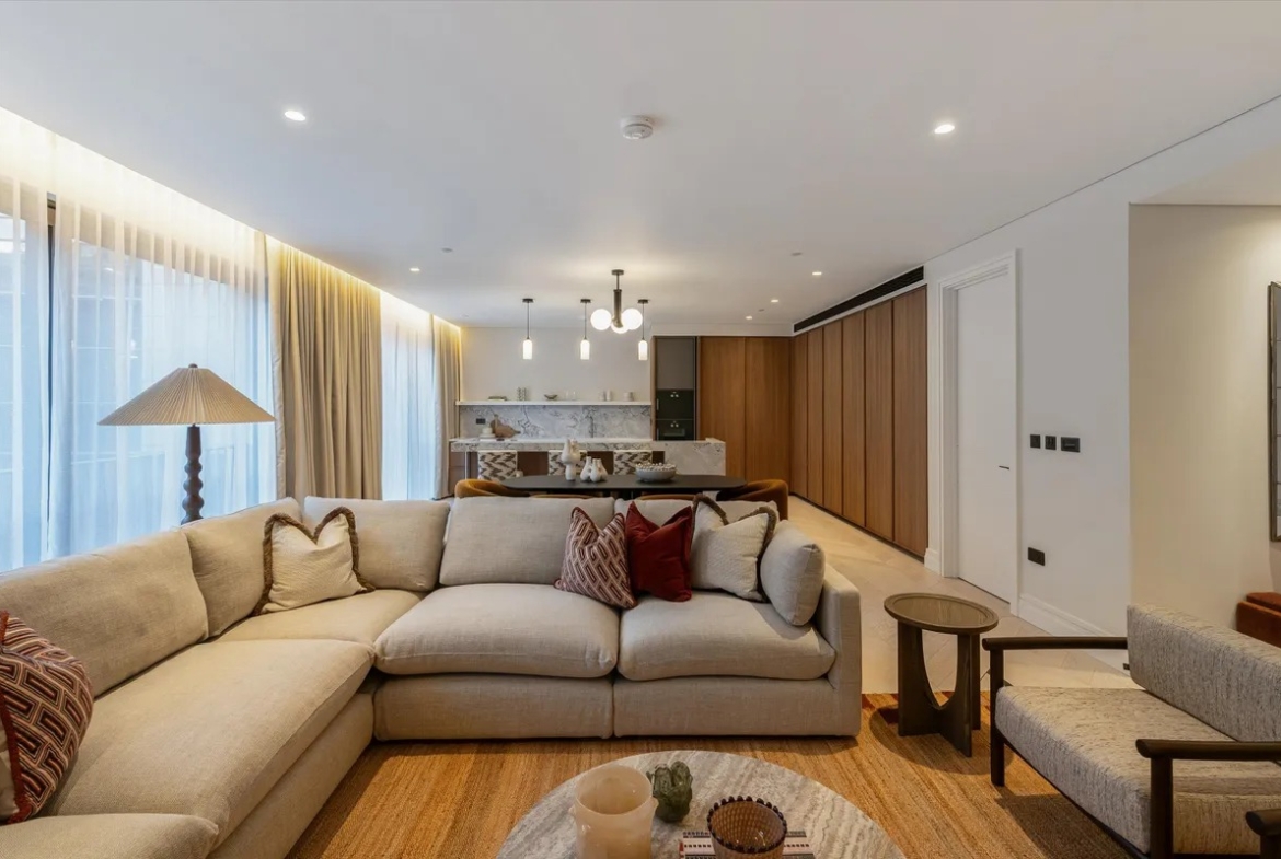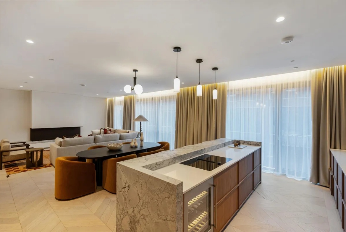 Die Wohnung ist vollständig und modern möbliert. Die Möbel sind in einem guten Zustand und passen gut zum offenen Wohnkonzept. Der Boden in der gesamten Wohnung besteht aus hochwertigem Parkett aus natürlichem Holz, was den Räumen eine warme Atmosphäre gibt. Die offene Küche im amerikanischen Stil ist praktisch gestaltet und integriert sich harmonisch in den Wohnbereich.