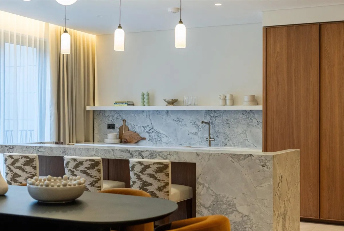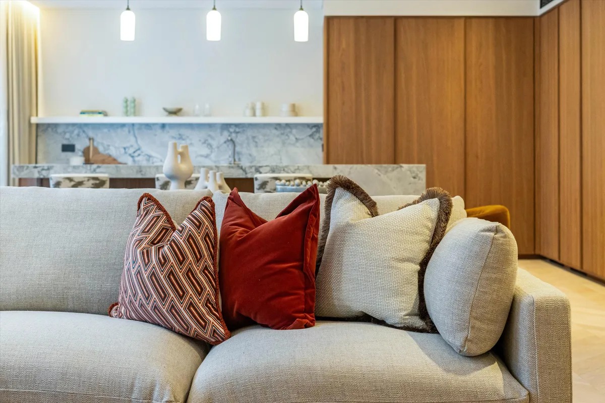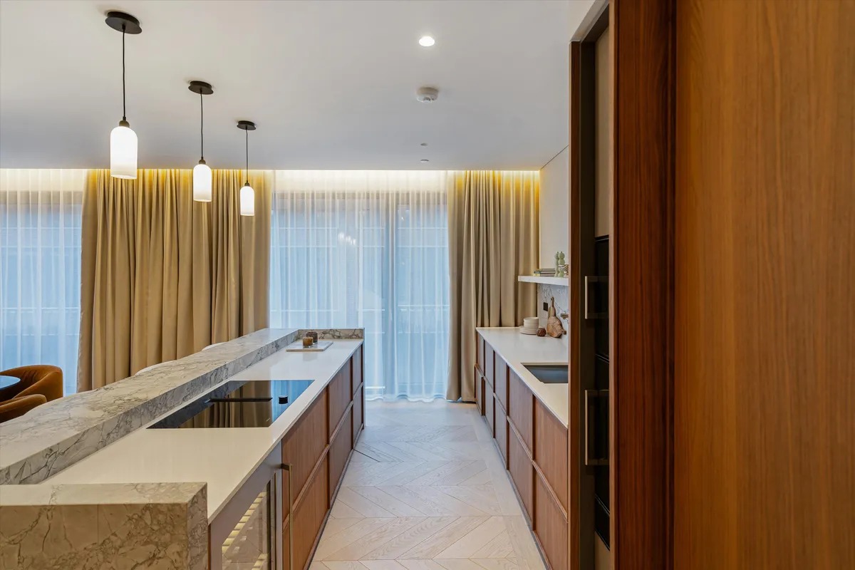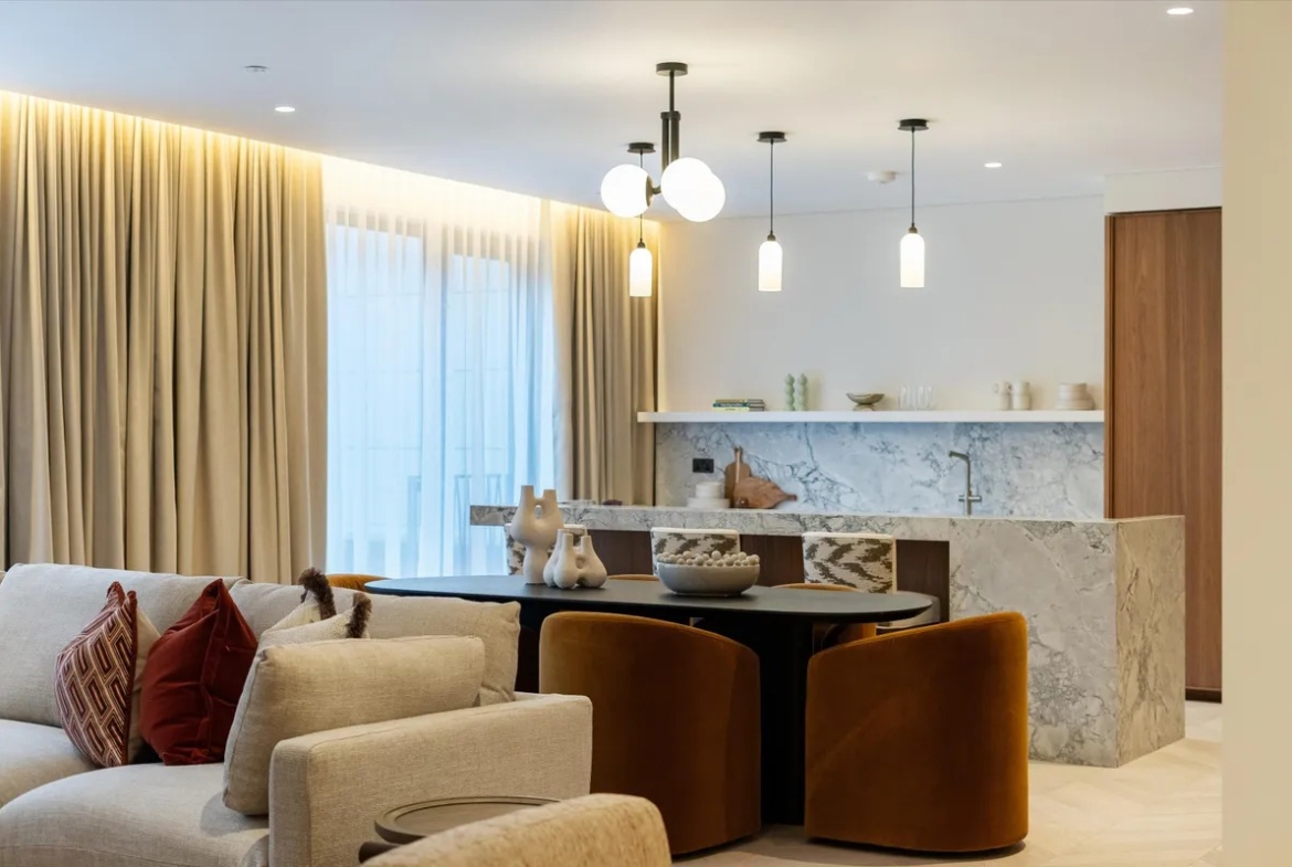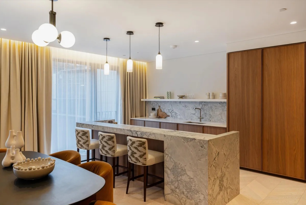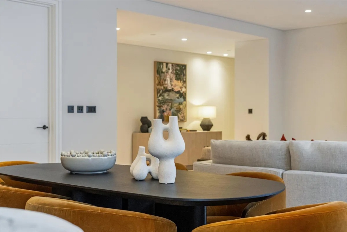 Die Wohnung ist vollständig und modern möbliert. Die Möbel sind in einem guten Zustand und passen gut zum offenen Wohnkonzept. Der Boden in der gesamten Wohnung besteht aus hochwertigem Parkett aus natürlichem Holz, was den Räumen eine warme Atmosphäre gibt. Die offene Küche im amerikanischen Stil ist praktisch gestaltet und integriert sich harmonisch in den Wohnbereich.