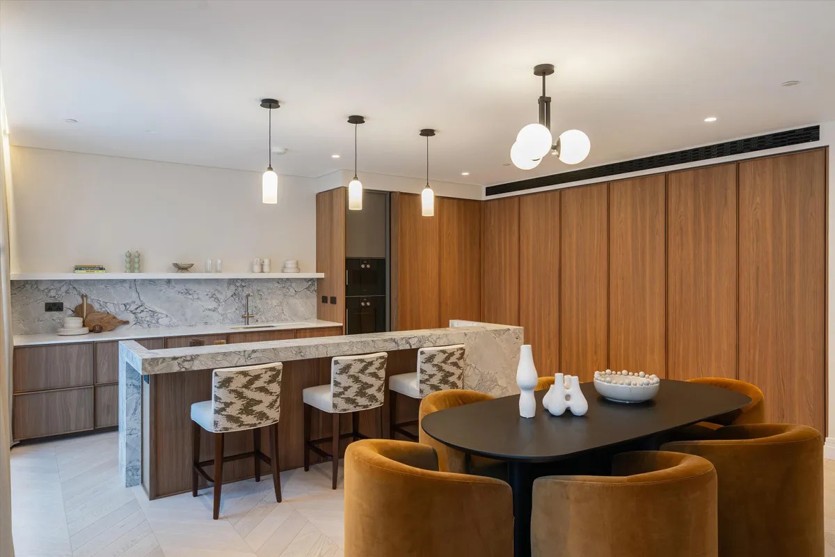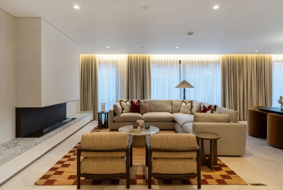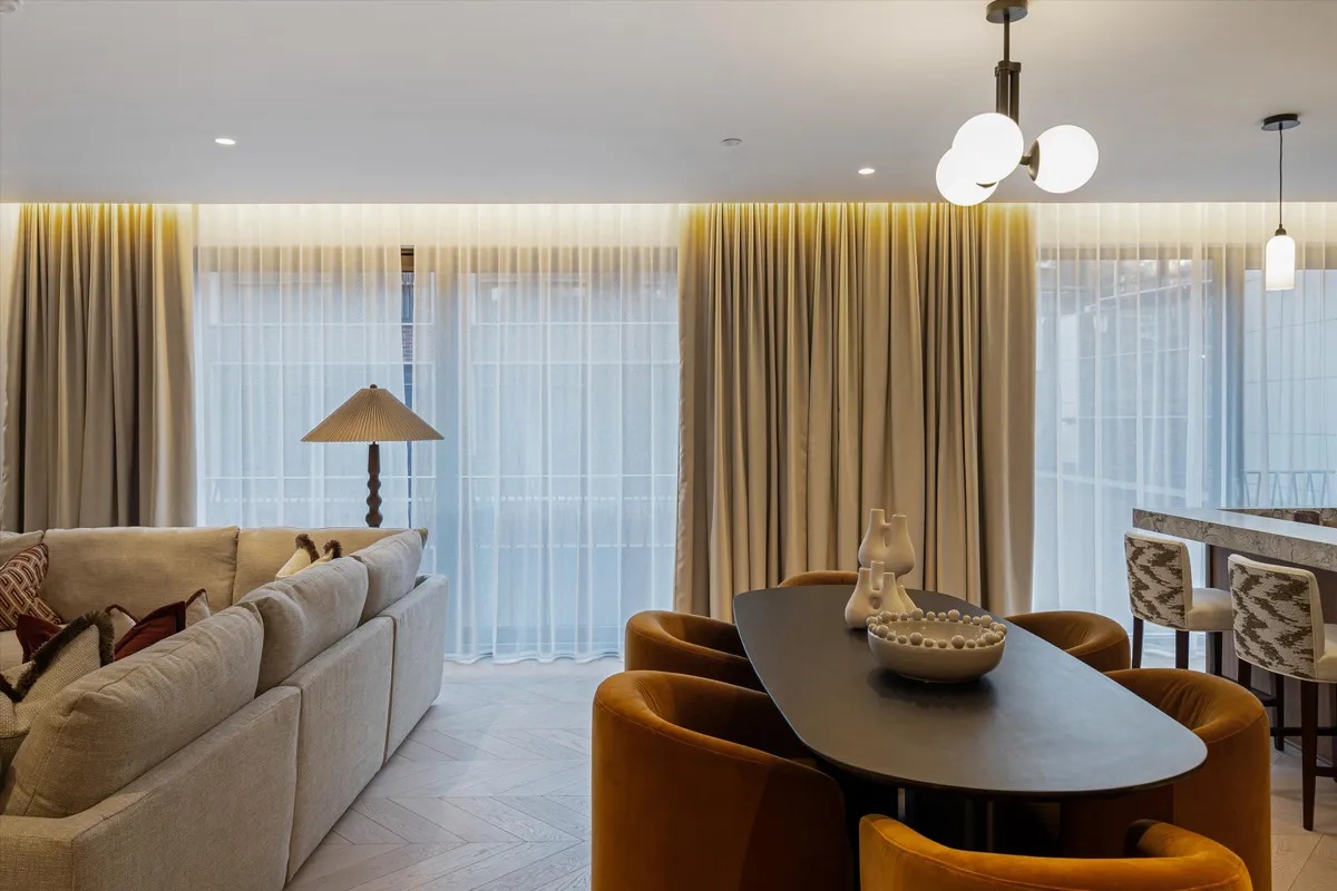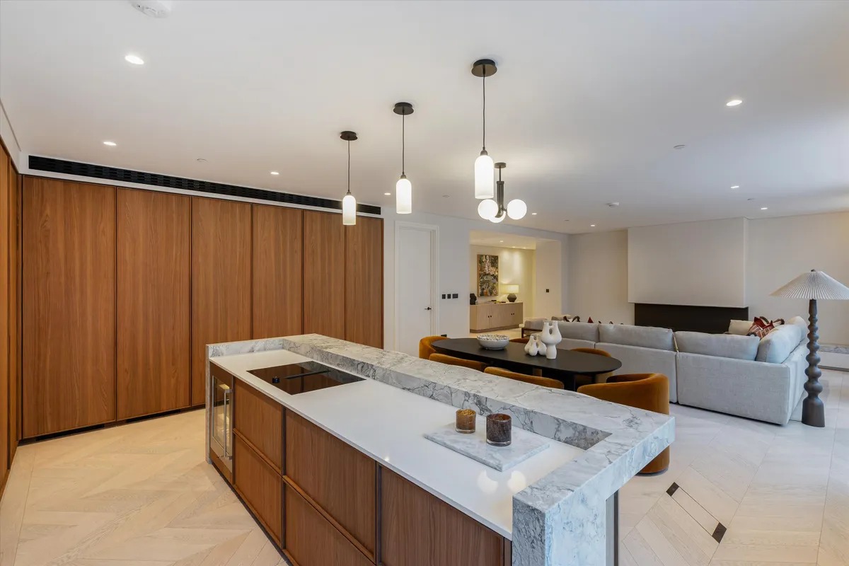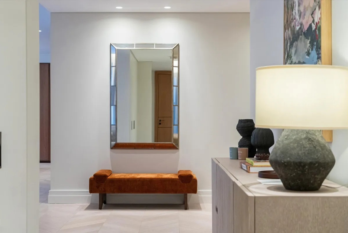 Die Wohnung ist vollständig und modern möbliert. Die Möbel sind in einem guten Zustand und passen gut zum offenen Wohnkonzept. Der Boden in der gesamten Wohnung besteht aus hochwertigem Parkett aus natürlichem Holz, was den Räumen eine warme Atmosphäre gibt. Die offene Küche im amerikanischen Stil ist praktisch gestaltet und integriert sich harmonisch in den Wohnbereich.