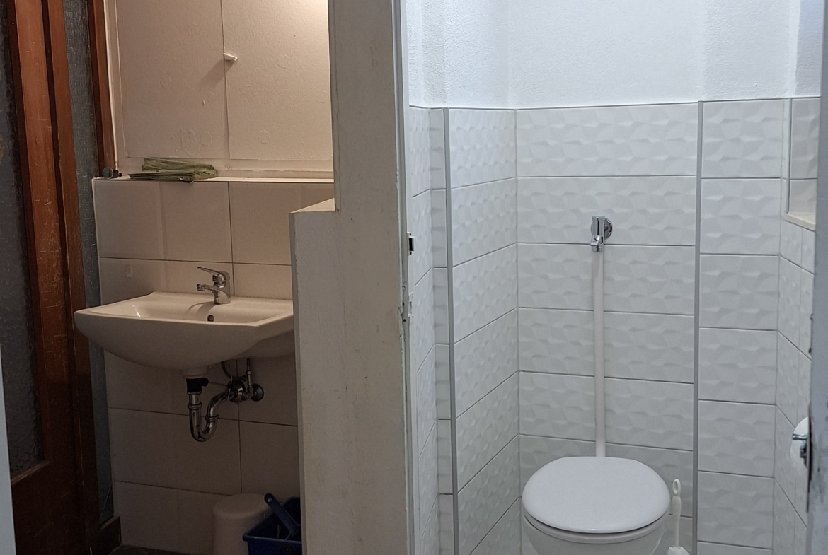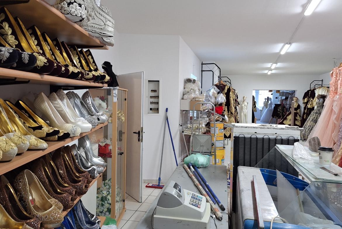 Die Gewerbefläche hat insgesamt 165 m², eingeteilt in einen Eingangsbereich mit Schaufenster von 27 m², einen mittleren Bereich von 63 m² sowie einem weiteren hinteren Raum von 75 m² als Verkaufsraum, Lager oder Behandlungsfläche. Dazu kommen eine Toilette sowie ein kleiner Kellerraum. (Plan siehe nächste Seite)