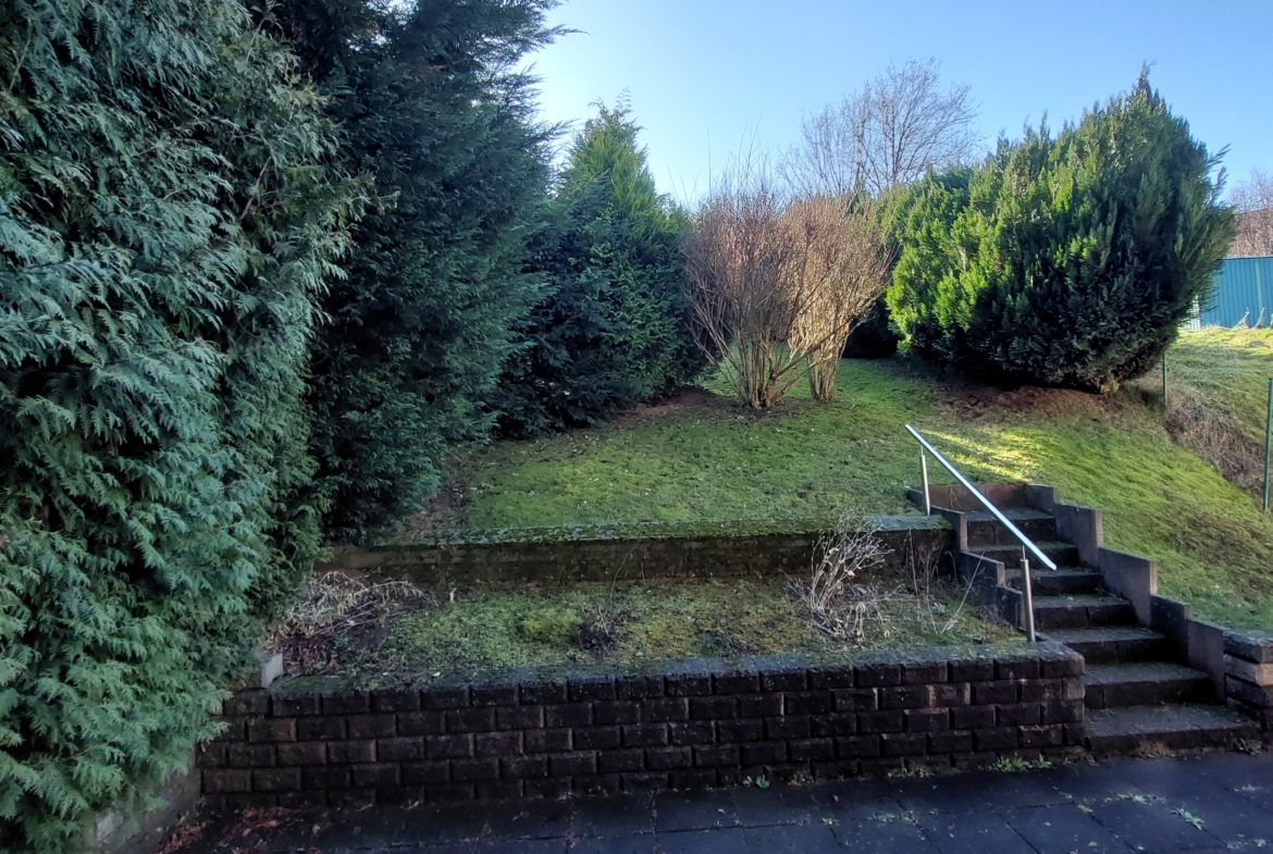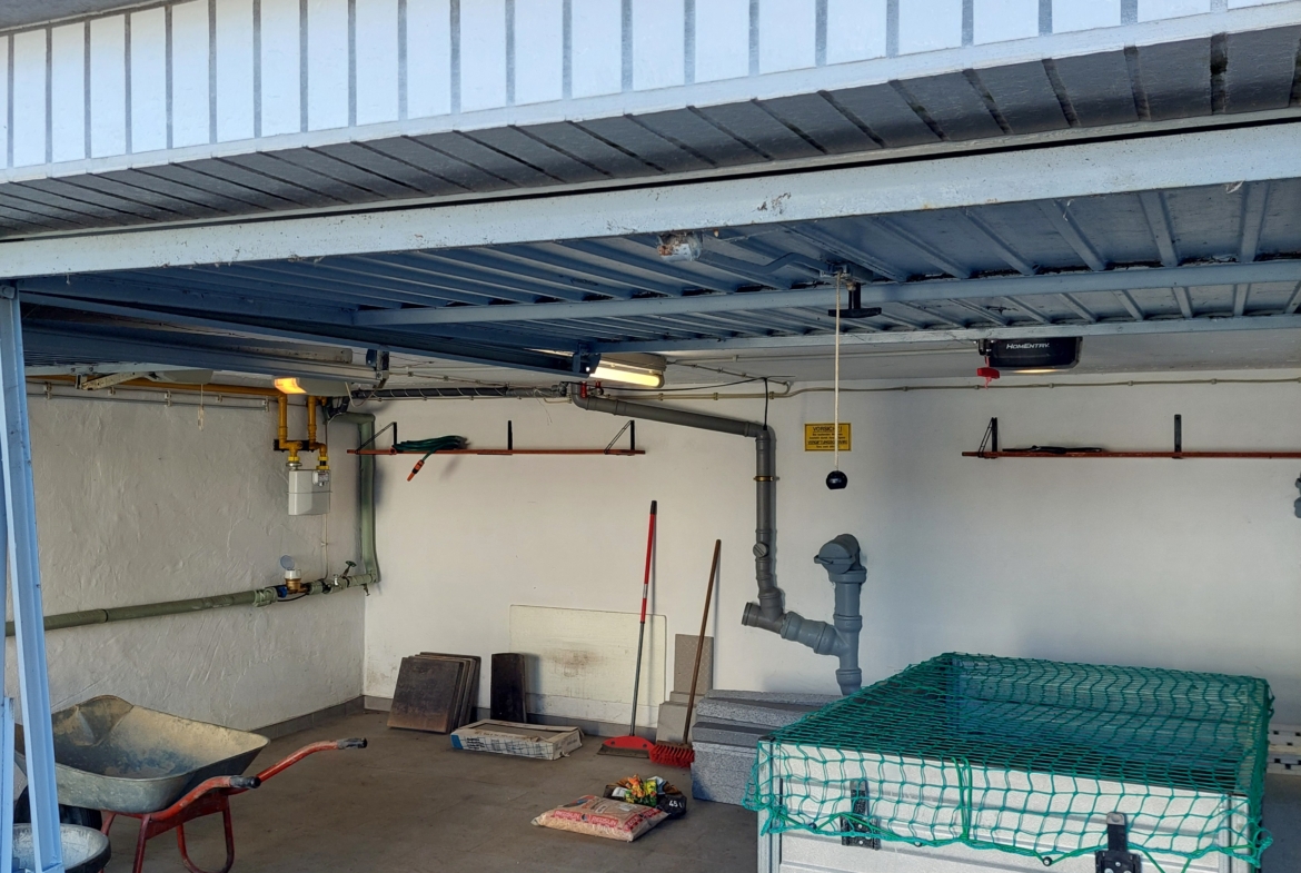 Es verfügt über eine Doppelgarage, einer großen Terrasse, einen kleinen Balkon und einem grünen Garten mit leichter Hanglage.
